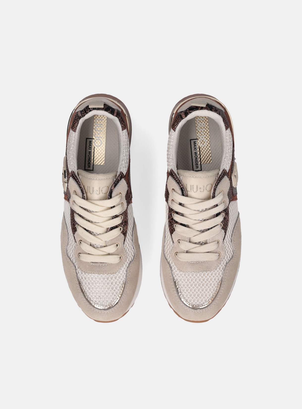 Street-chic et lumineuses, ces sneakers LIU JO combinent daim & mesh avec des empiècements imprimé python et des détails effet lamé. Logo LJ métal sur le côté, étiquette jacquard sur la languette, spoiler talon métallisé. Semelle plateforme multicouche crantée (4,5 cm) : silhouette allongée, confort au quotidien.
