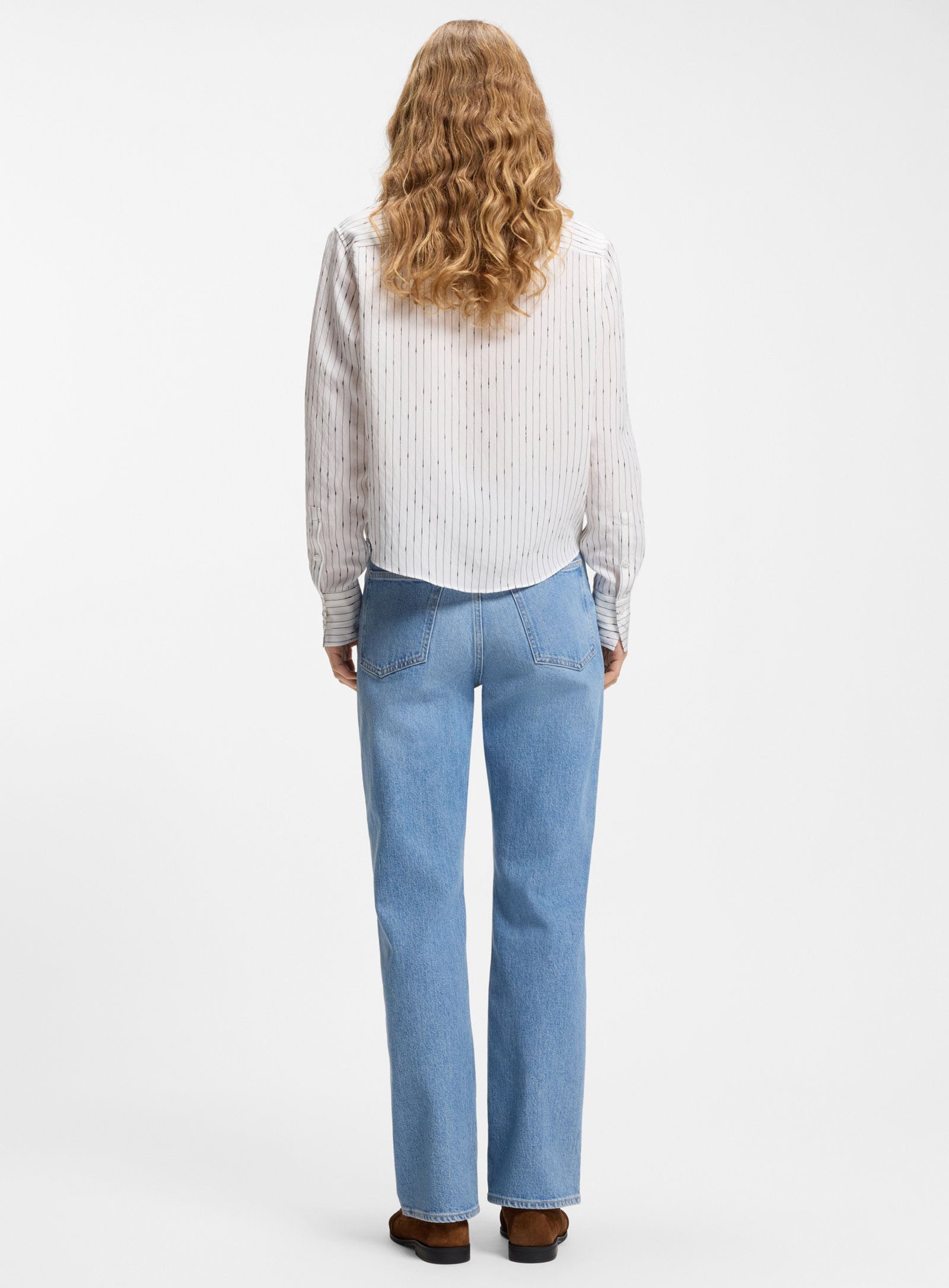 Portez-le avec un pantalon tailleur ou un jean droit pour un chic casual impeccable, puis ajoutez un blazer pour une tenue plus structurée. Il se marie aussi très bien avec une jupe midi : la ligne reste féminine, graphique et moderne.