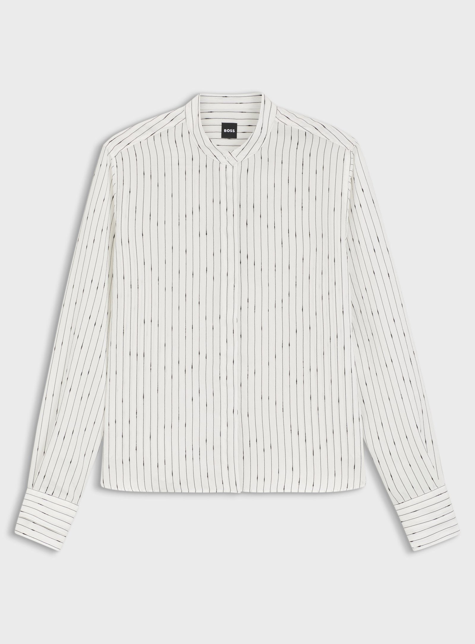 Élégant et facile à porter, le chemisier BOSS Bertyna_Monday mise sur des rayures revisitées et une toile douce pour composer des tenues aussi bien habillées que décontractées. Sa coupe Regular Fit droite et son col mao donnent une allure moderne et épurée, tandis que les manches longues et les poignets 1 bouton assurent une finition soignée. Fluide et agréable sur la peau grâce au mélange modal, le modèle Bertyna_Monday devient un essentiel chic-urbain du quotidien.