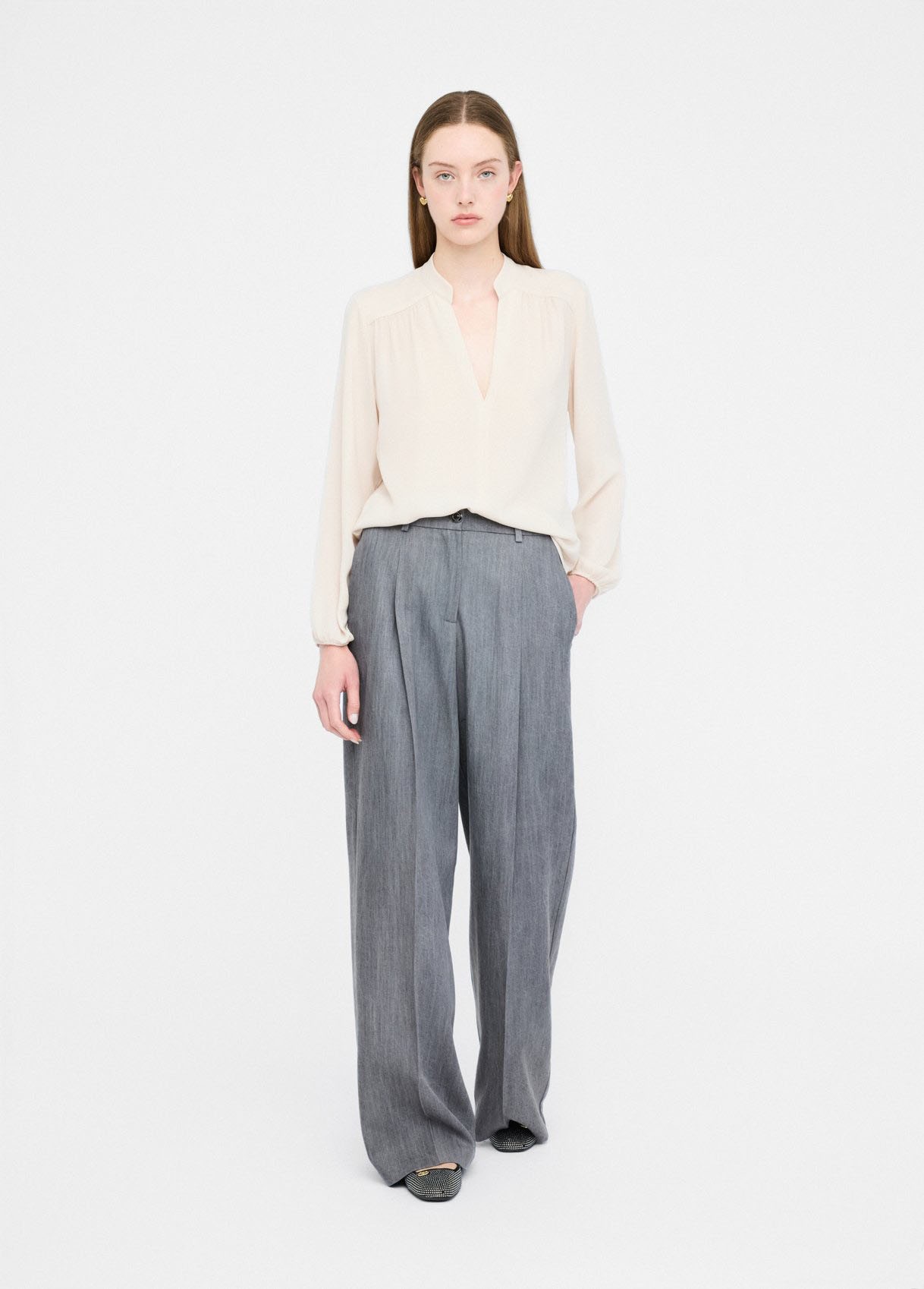 Coupe : Taille haute, jambe évasée (flare), pinces & pli marqué