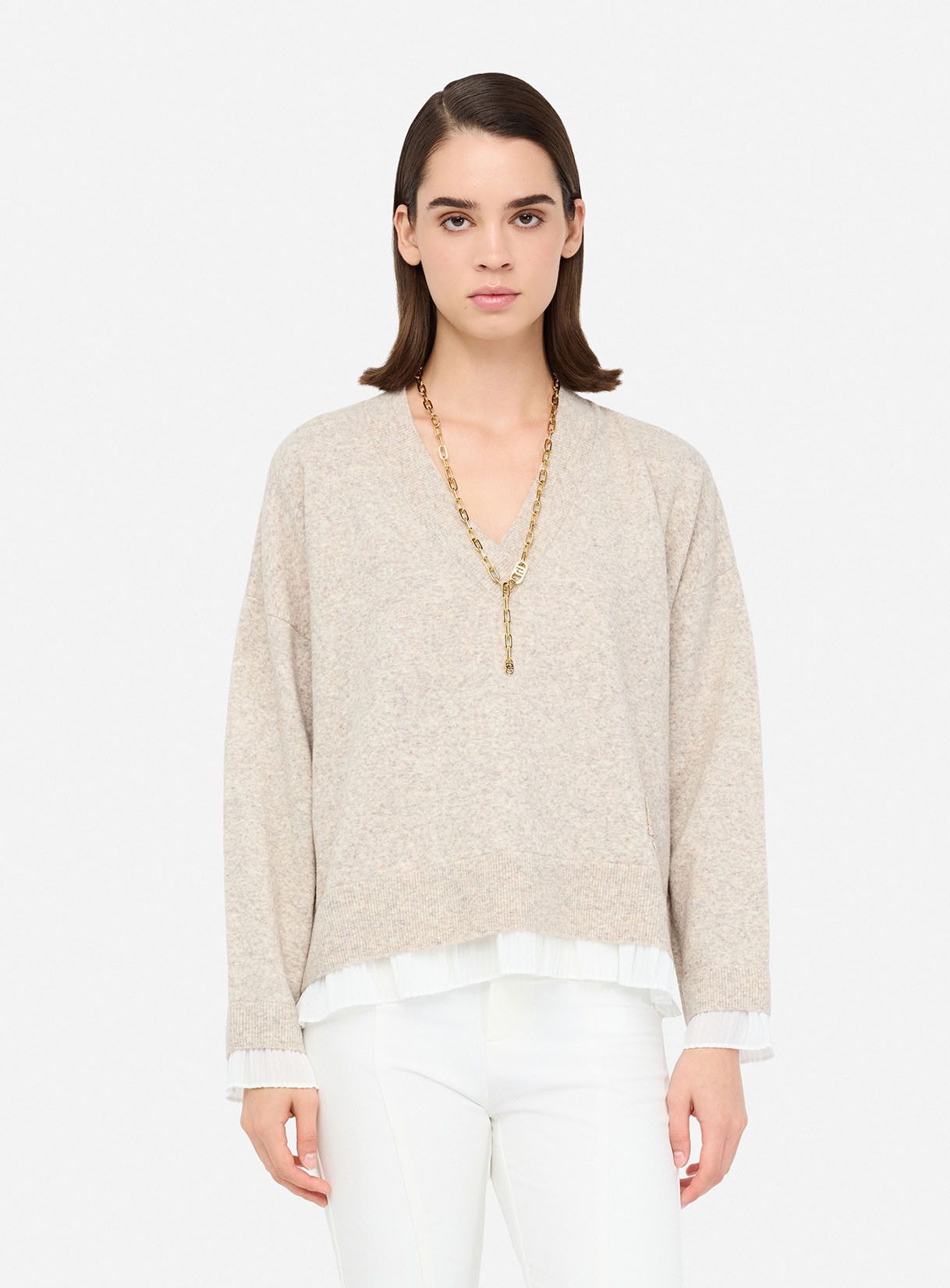 Féminin et moderne, ce pull LIU JO en laine mélangée flatte la silhouette avec son décolleté V et son bas souligné de volants en crêpe plissé. Le logo brodé à l’avant signe une touche précieuse — une maille chic du bureau au soir.