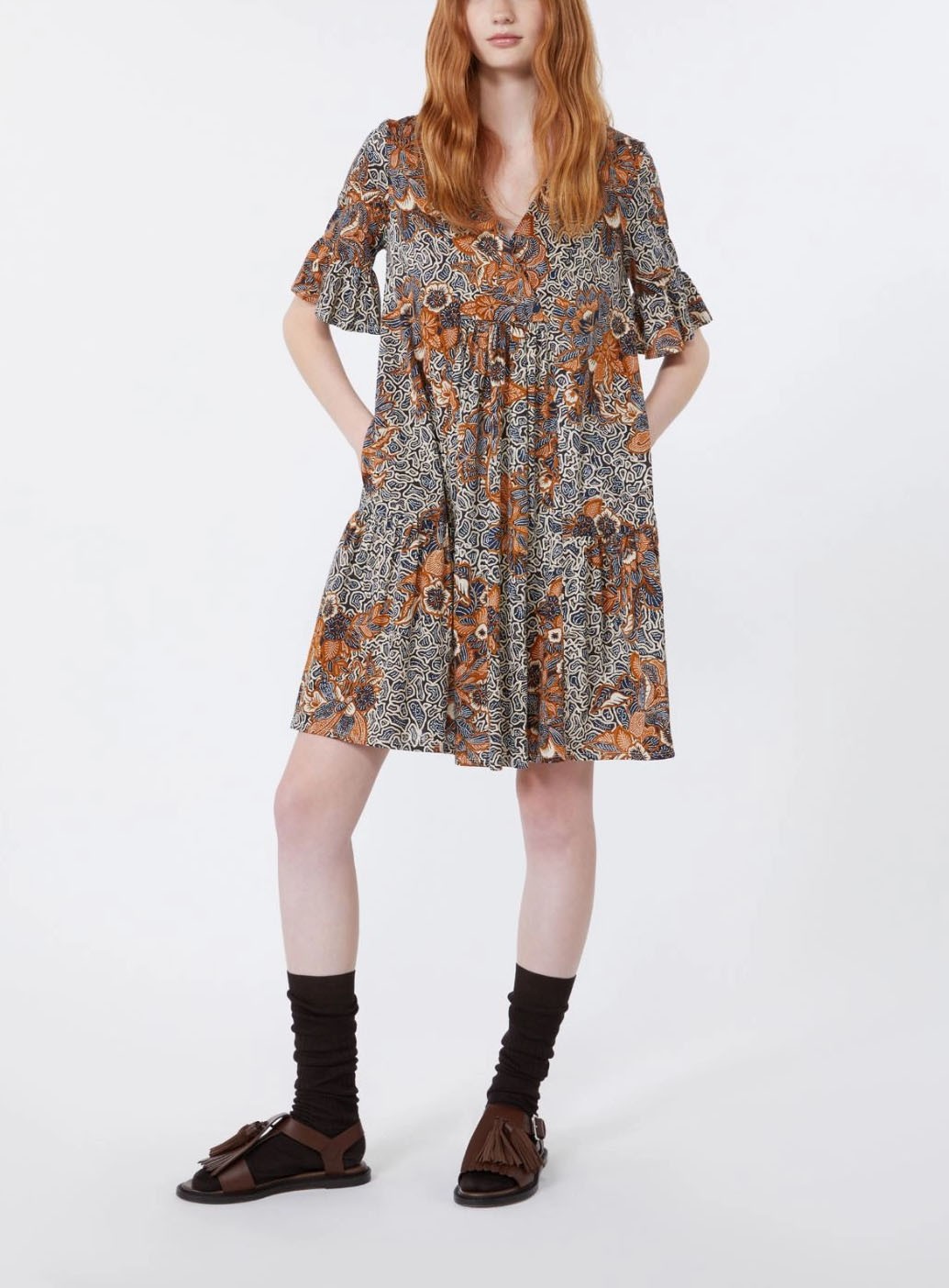 Légère et féminine, la robe imprimee Weekend Max Mara Fuoco est confectionnée en jersey de pur coton et sublimée par un motif imprimé intégral. Inspirée du caftan, sa ligne évasée et sa jupe à volants créent un mouvement fluide et élégant. Son col en V croisé, ses manches courtes montées avec volant et ses poches latérales intégrées rendent le modèle Fuoco aussi pratique que raffiné, parfait pour les beaux jours.