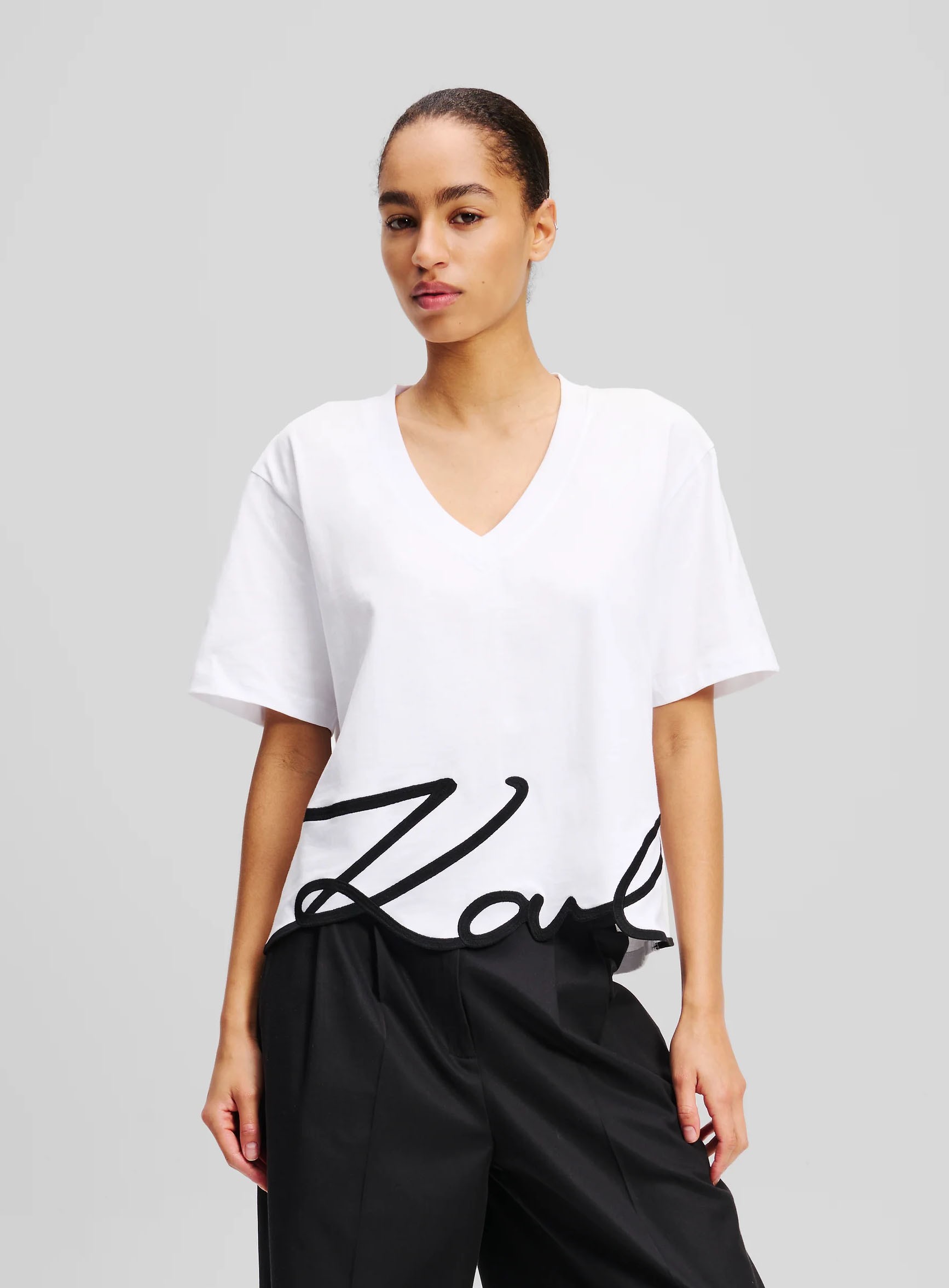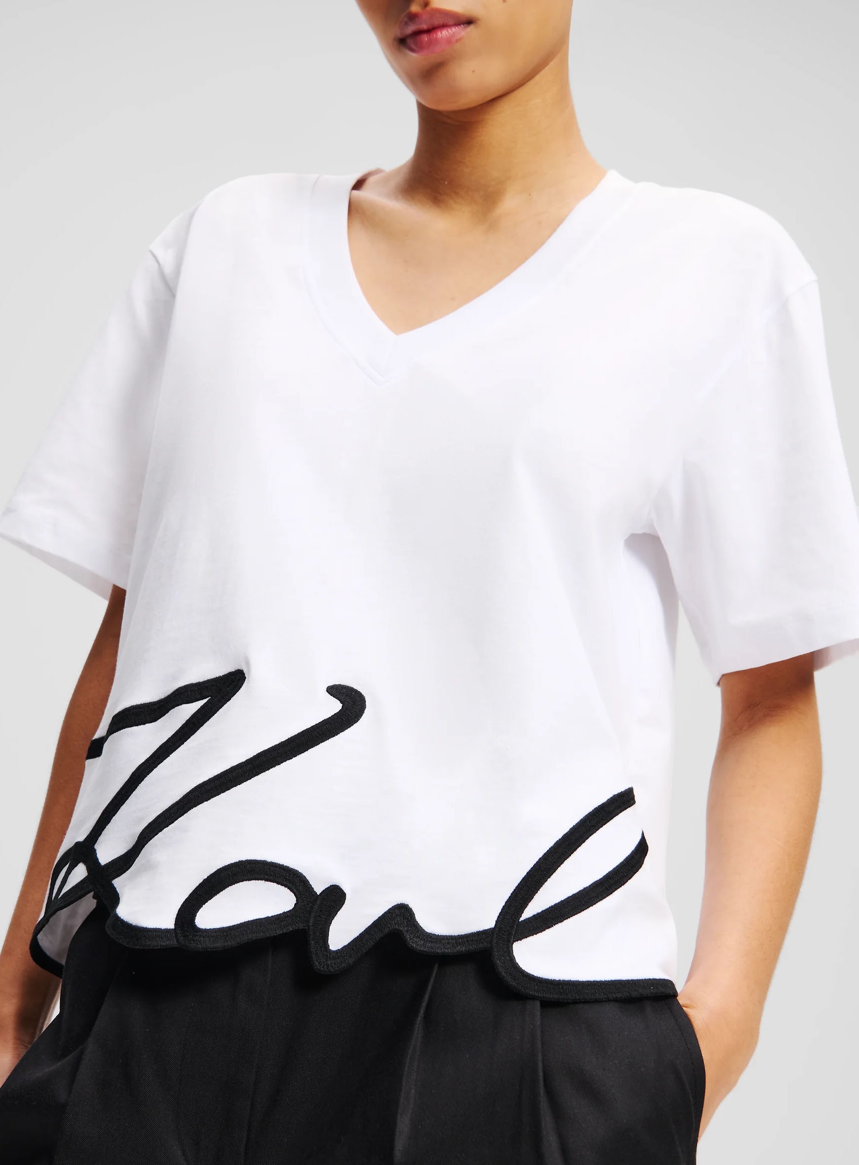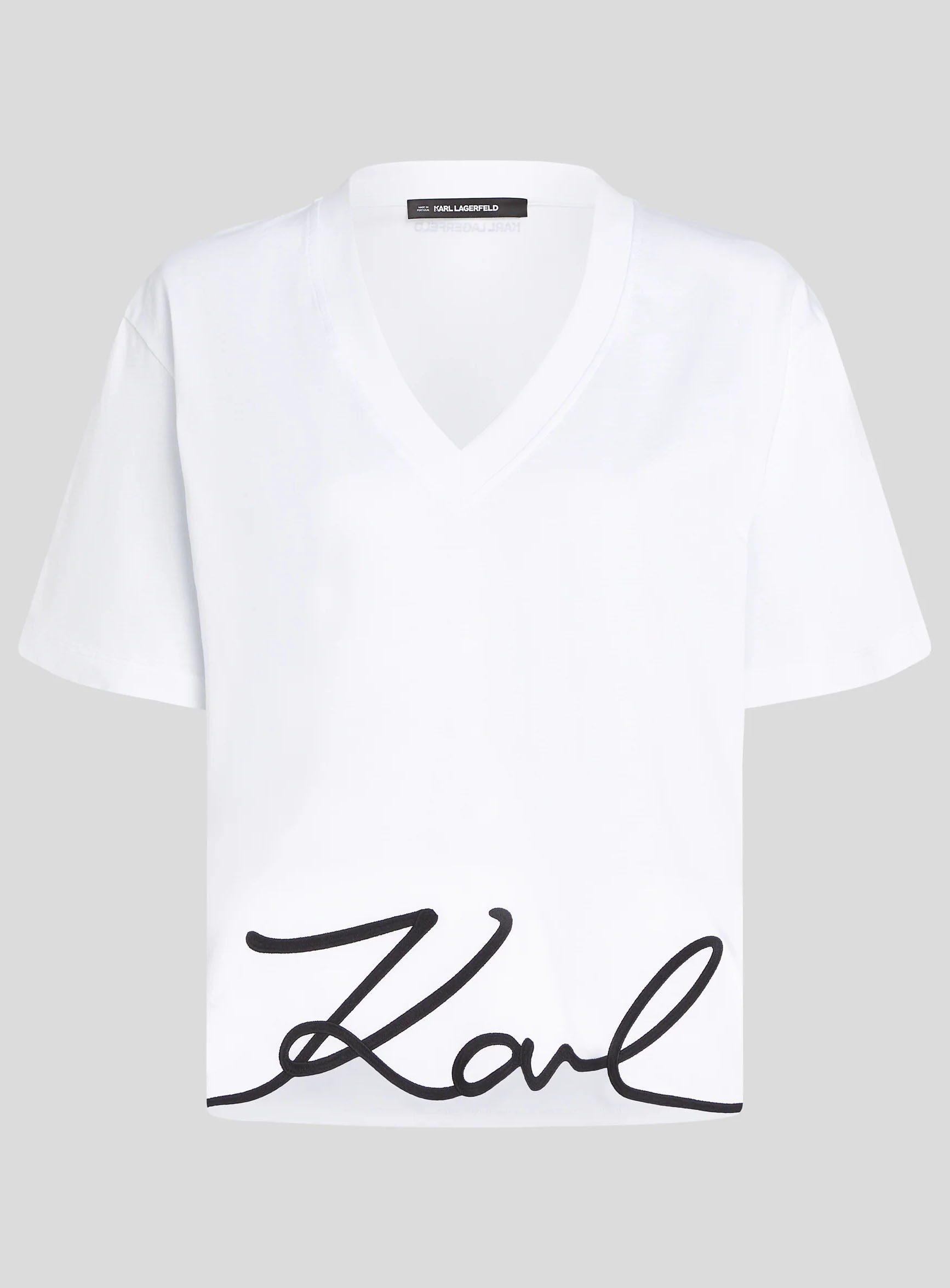 Chic sans effort : ce t-shirt légèrement raccourci affiche une coupe boxy décontractée et un décolleté en V flatteur. La broderie KARL SIGNATURE apporte l’élégance iconique, le jersey 100% coton biologique le confort premium. Fabriqué au Portugal.