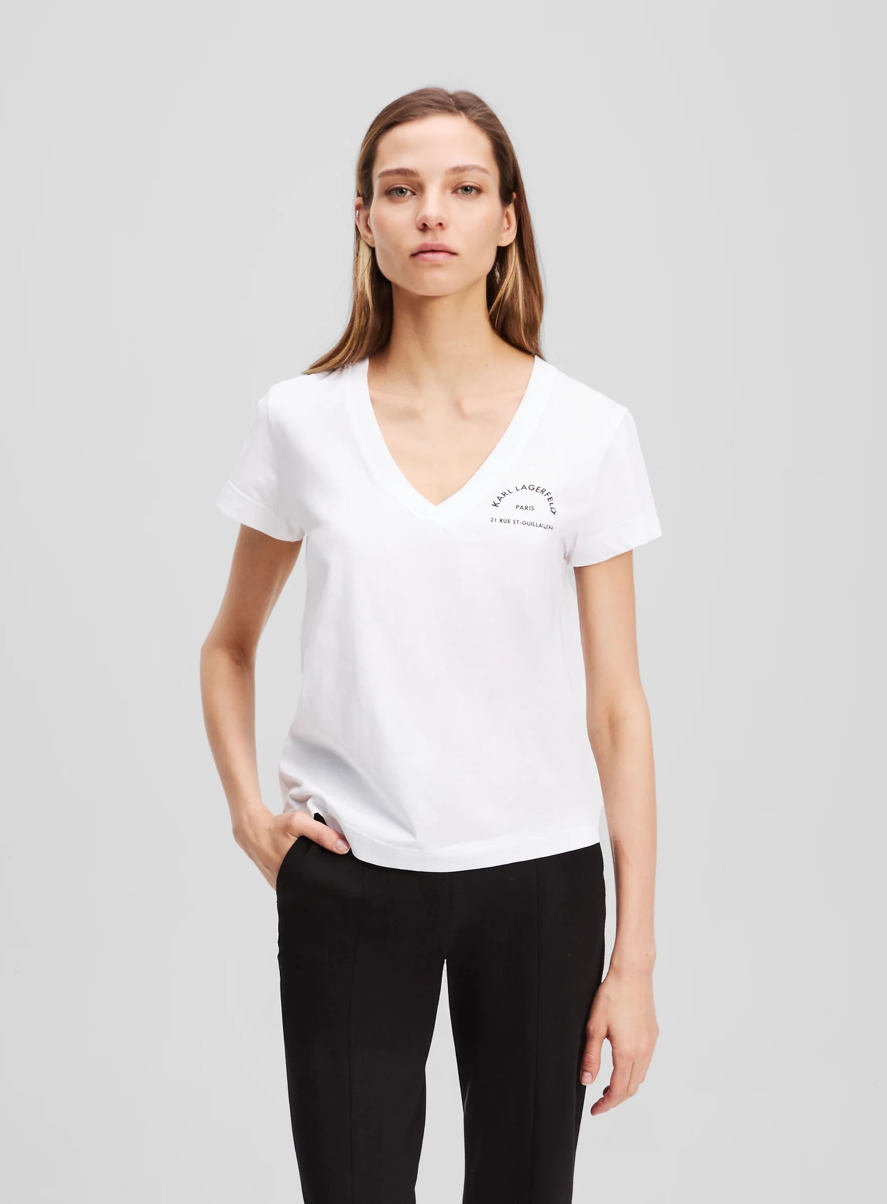Notre sélection KARL LAGERFELD mêle lignes épurées et signatures iconiques. Ce col V Rue St-Guillaume élève instantanément un jean, un short tailleur ou une jupe midi.