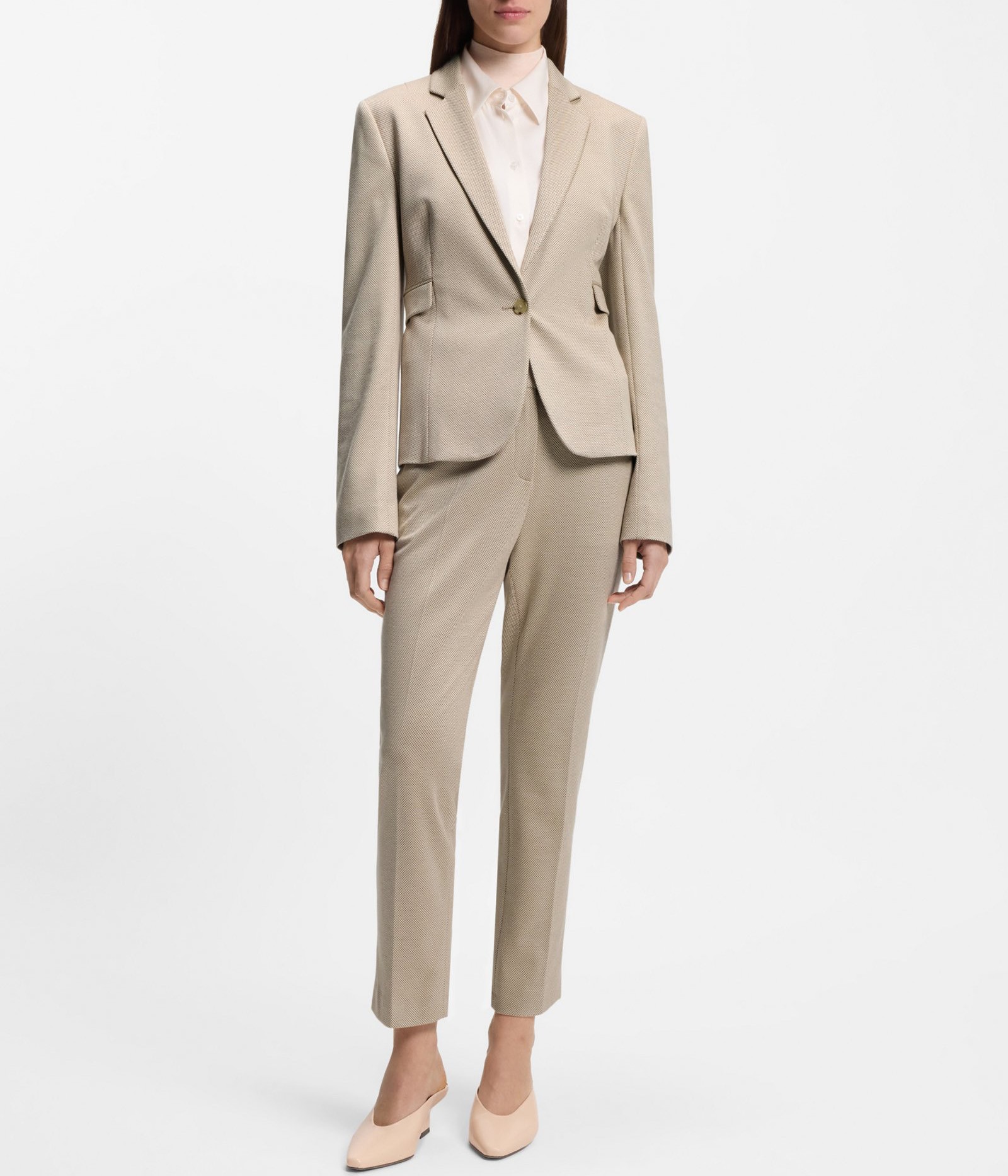 Pensée pour les journées actives et les déplacements, la veste slim BOSS Jia13 en jersey stretch performant à motif, lavable et infroissable ; modernise le tailleur. Sa coupe Slim Fit et sa fermeture 1 bouton structurent la silhouette, tandis que les revers crantés et les poches à rabat signent une allure bureau impeccable. Entièrement doublée, la veste Jia13 combine confort et tenue, avec au moins 80 % de matières premières plus responsables, dont des fibres de cellulose issues de forêts gérées de manière responsable.